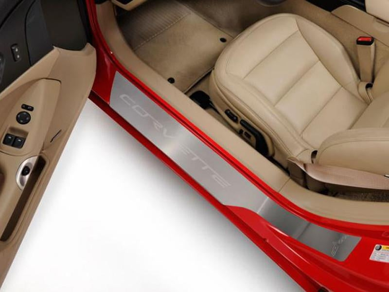 C6 Corvette Full Length Outer Doorsills Brushed Stainless Steel - Corvette Script