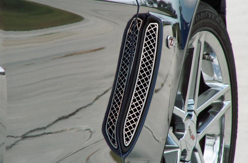 Dress up your Corvette with our Polished Laser Mesh Stainless Steel Side Vent Grilles. This Corvette accessory is designed to fit 2006-2013 Z06 Corvettes, in the side fender vents, and adds a clean stylish look to your Corvette exterior.
