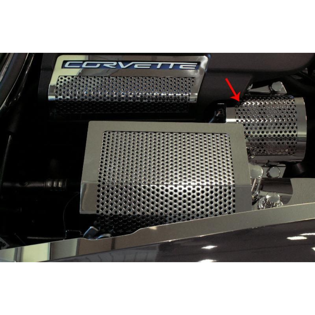 Dress up your C6 Corvette with our Polished Stainless Steel Perforated Alternator Cover. These trim pieces are designed to fit the 2009-2012 ZR1 Corvette only. It covers the alternator and adds a clean stylish look to your Corvette engine bay.