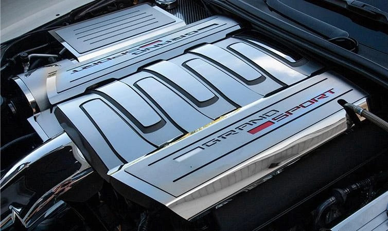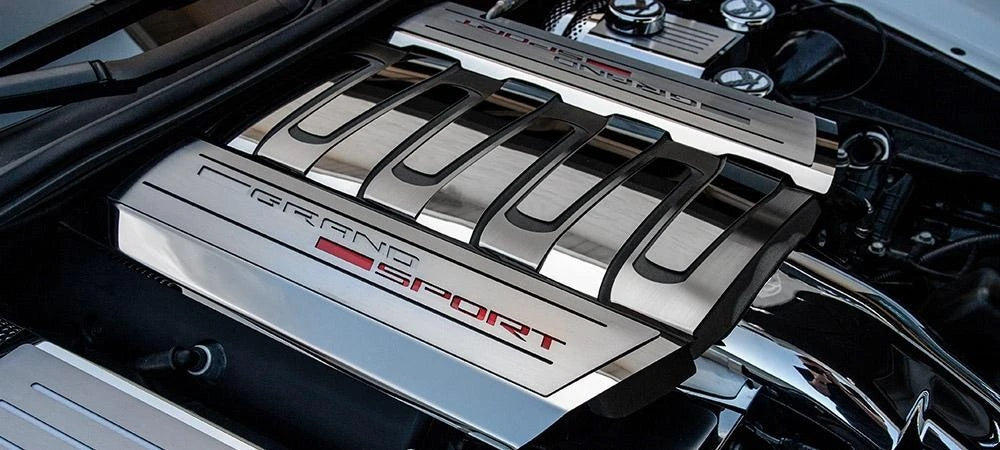 Dress up your Corvette with our GM Official Licensed polished and brushed stainless steel Grand Sport Fuel Rail Covers Factory Overlay with white and red vinyl inlaid lettering. These overlays install easily over factory fuel rails, adds a custom look to your Corvette engine bay.