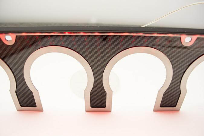 Exceptional style. Available with or without red LED illumination. Turn some heads with our new Exhaust Filler Panel crafted from real Carbon Fiber and trimmed in brushed stainless steel. Kits available for both STOCK and NPP Dual-Mode exhaust systems. This exhaust filler panel is designed to fit 2014-2019 Corvettes around the exhaust tips and give it a finished high-quality look.