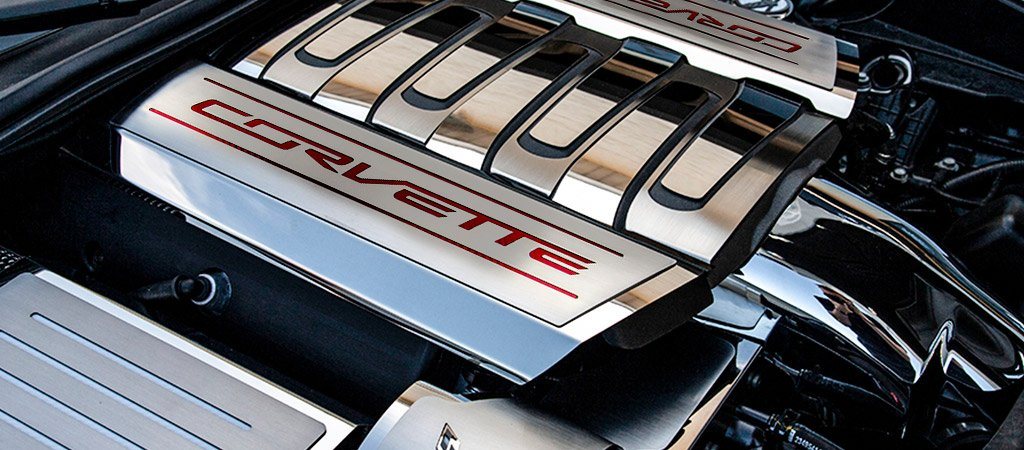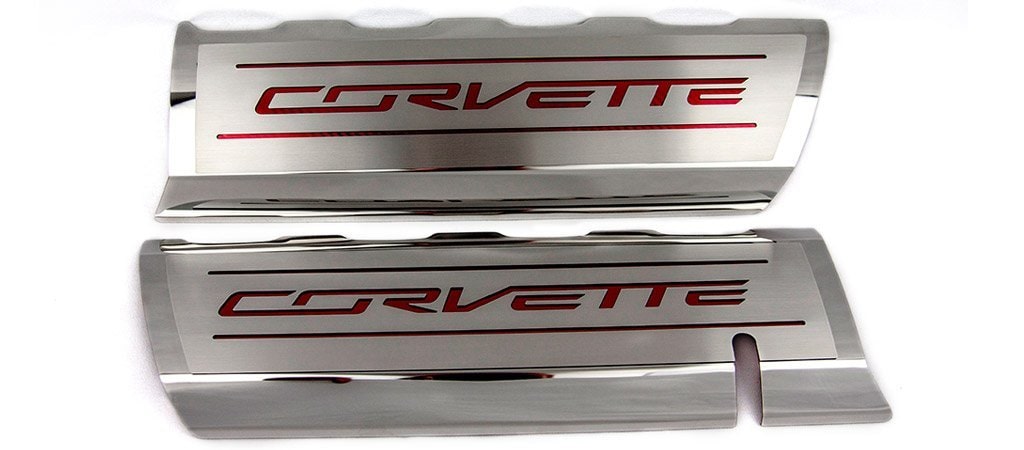 Dress up your 2014-2019 C7/Z51 Corvette Stingray with our polished stainless steel  'CORVETTE' Style Fuel Rail Covers in your choice of vinyl inlay color for the CORVETTE lettering. This Official GM Licensed fuel rail dress kit is designed to fit all C7/Z51 Corvettes over the factory plastic fuel rail covers and add a winning style to your Corvette engine bay. They feature a polished base with a laser-cut brushed top plate. Be ready to take the prize when you show up with a dazzling engine bay.