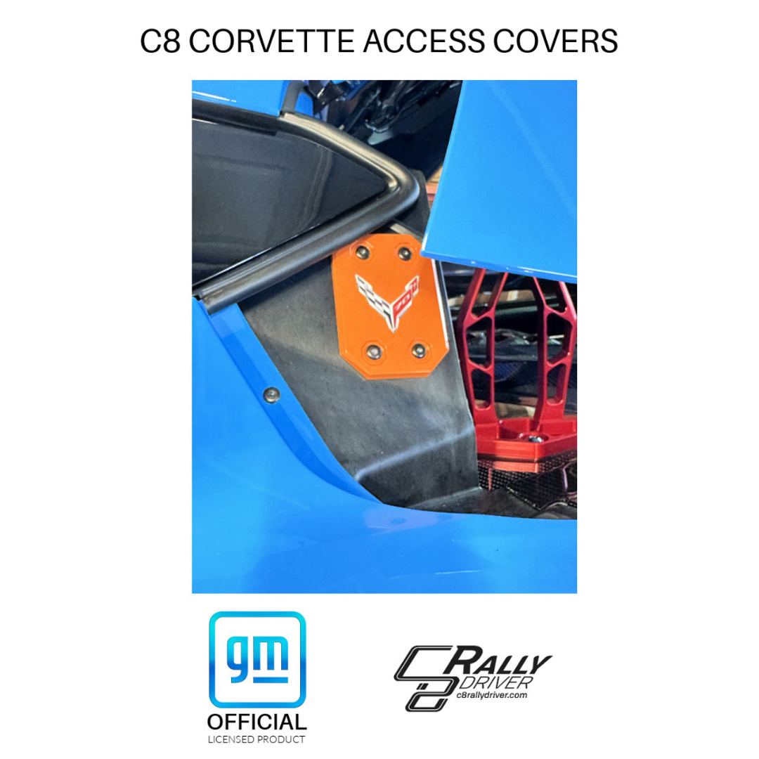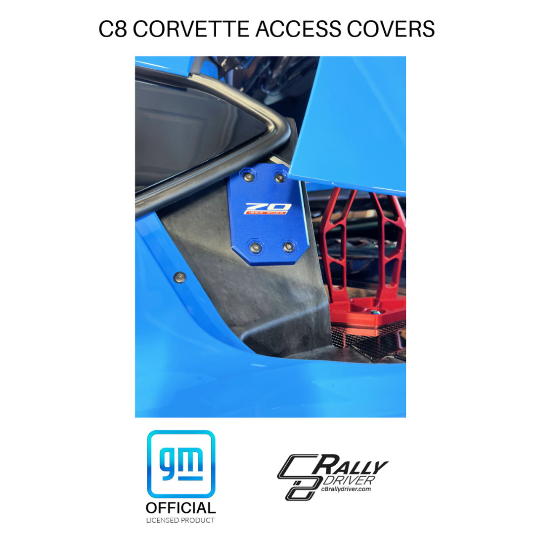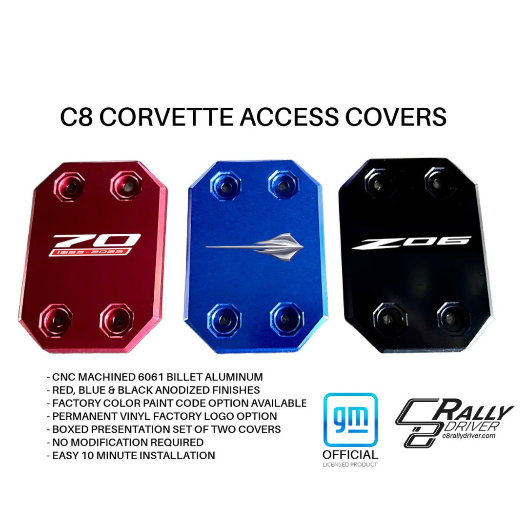 The C8RallyDriver C8 Corvette Access Covers for the 2020+ C8 Corvette Stingray, Z06 and E-Ray are machined from 6061 billet aluminum. This GM Officially Licensed Product is designed to compliment the Corvette C8 styling, these professionally designed and engineered covers will add the extra style in your Corvette engine bay for car shows and other events. These covers compliment and perfectly match our custom C8RallyDriver Rear Hatch Support Brackets and are direct bolt-on replacements for the factory stamped steel access covers while providing a huge improvement in style and appearance.