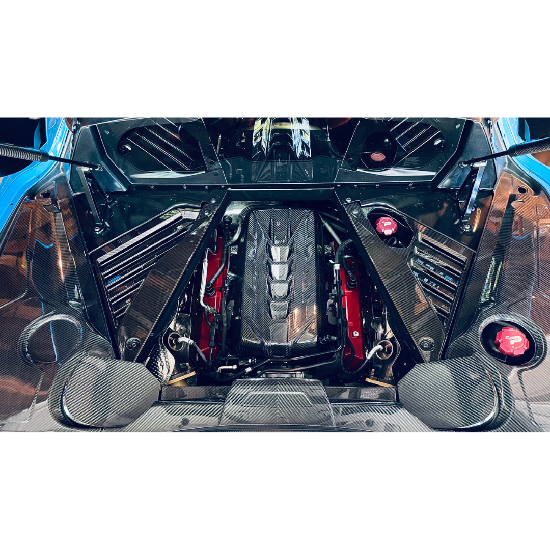 Upgrade the style of your C8 engine bay with these C8 Corvette Carbon Fiber Rear Strut Covers.