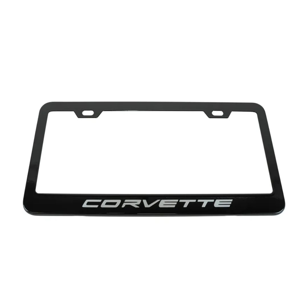 - Frame the license plate of your C8 Next Gen Corvette in style with this license plate frame in matte black finish that comes with the Corvette script in multiple vinyl colors.