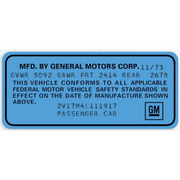 C3 1969-1972 Corvette GM Licensed Door Jamb VIN Data Decal - Blue - Sold Individually - CA