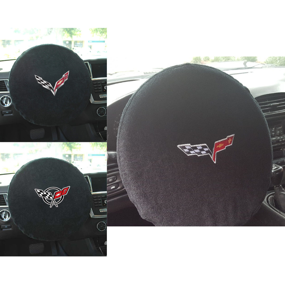 Protect your leather or suede Corvette steering wheel from harmful UV rays and dust while parked with this embroidered stretch steering wheel cover. Fits all C5, C6, and C7 Corvettes.
