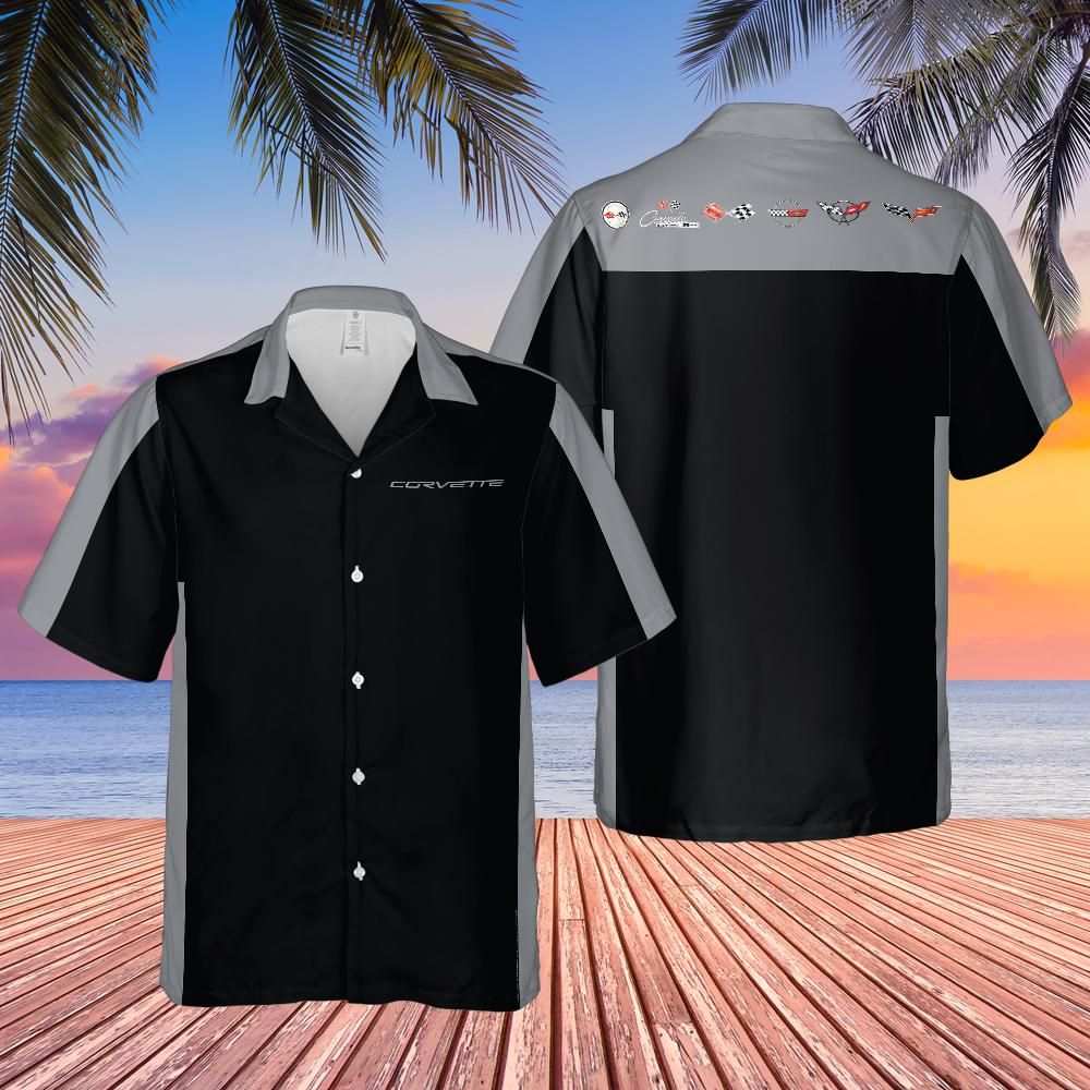 This Men's Short Sleeve Front Button Corvette Black and Machine Silver Metallic Color Block Hawaiian Style Shirt has a boxy fit and a notch lapel collar that are perfect for any laidback scenario. Featuring a bold black and Machine Silver Metallic color block design with Corvette C6 script on the front and a lineup of Corvette logos across the back yoke, it’s a standout piece for any Corvette fan. A go-to choice for men of all ages, this Hawaiian shirt pairs well with shorts and jeans or layered with other pieces to complete your look. It’s also a fun option for bowling nights or casual events where you want to show off your Corvette pride.