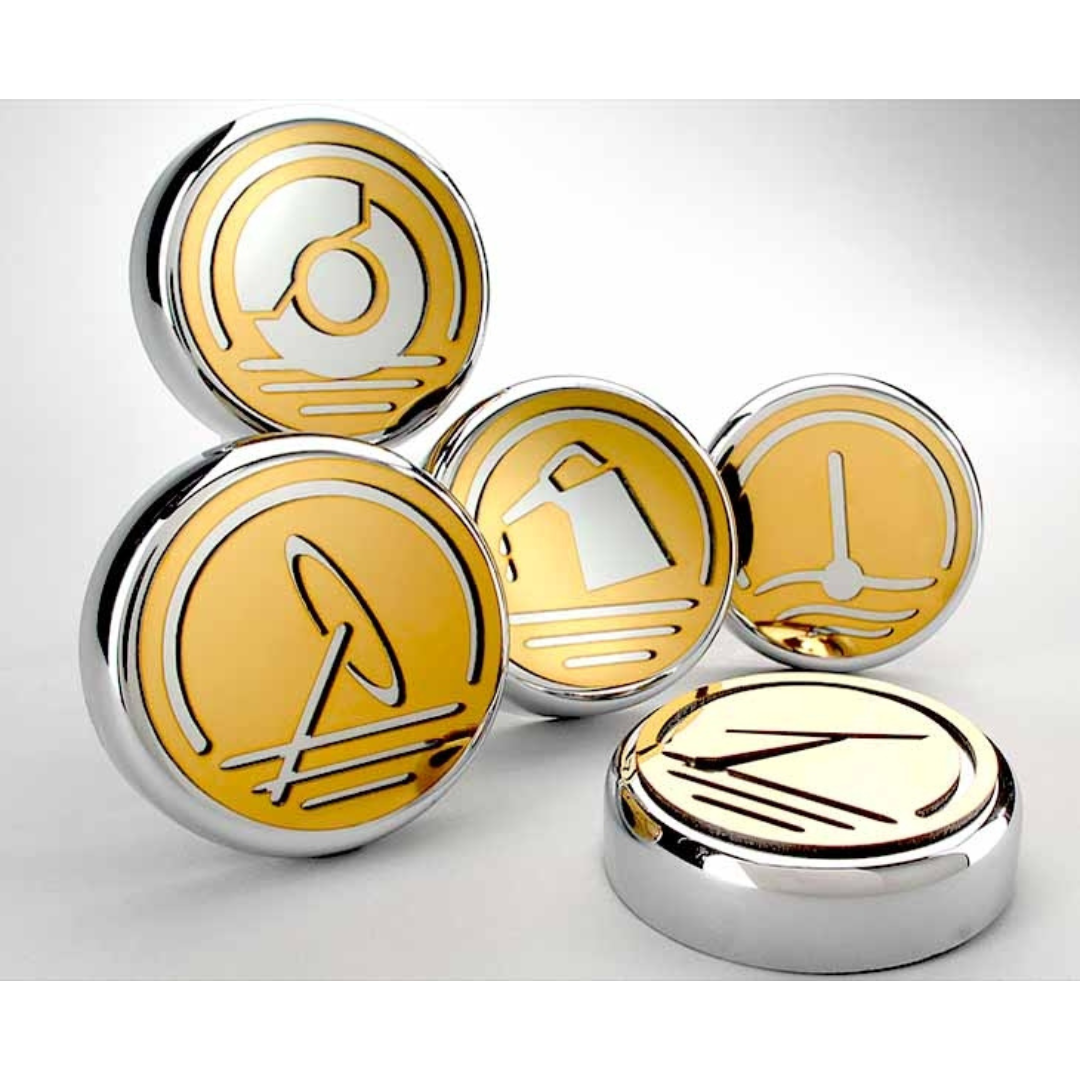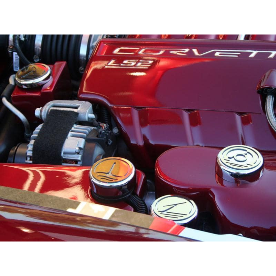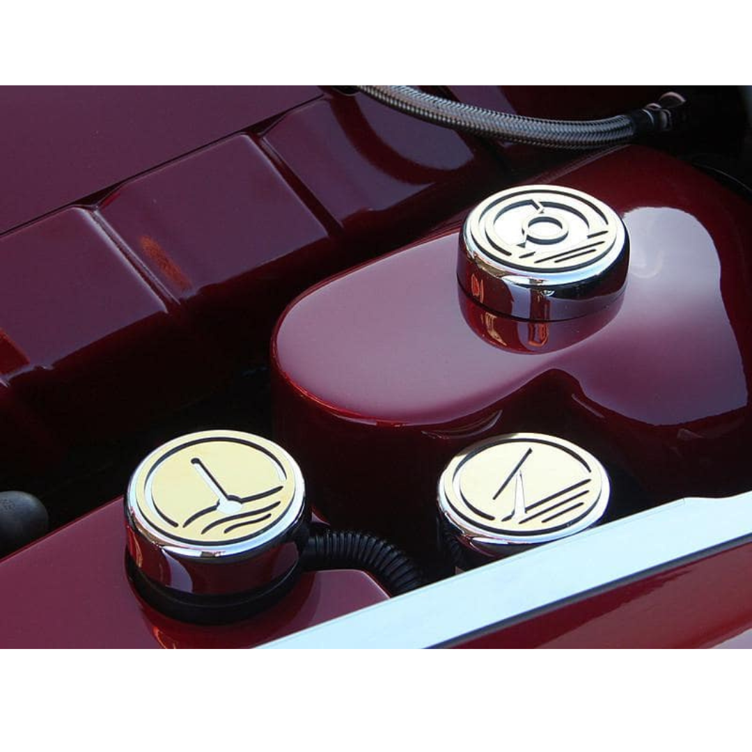 - Triple chrome-plated steel caps with gold-toned stainless steel top plates, laser-cut with engine fluid icon symbols.