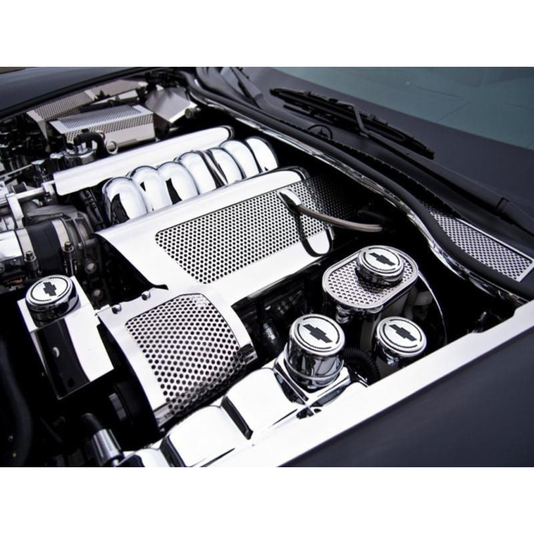 This 5pc triple chrome-plated steel body and stainless cap cover set are designed to cover your factory oil, brake fluid, water tank, windshield washer, and power steering fluid caps. Installs in seconds with Velcro attachment cookies for a fraction of what it costs to replace your factory caps!