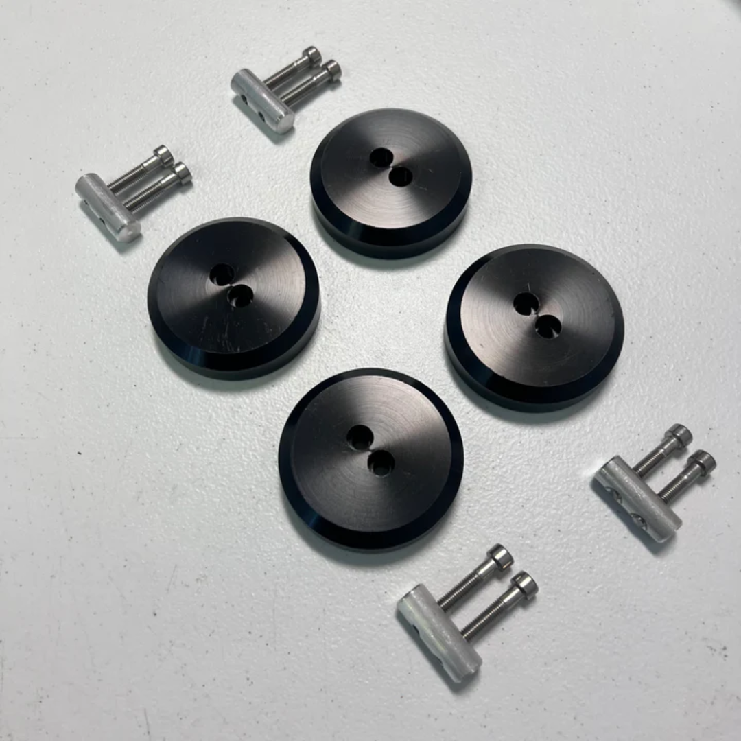 The original bolt-on lift points Made in the USA for the 1997-2024 Corvette (C8, C7, C6 & C5). Machined from American billet aluminum and designed to be left on the car. The stealth design also incorporates weight savings and a custom design to catch the attention of the mechanic or shop preparing to lift your vehicle.