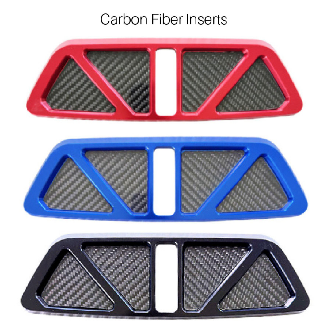 Finish is hard anodized black, anodized red or anodized blue. If you want to add a flash of color or customize, you can select the optional factory paint color inserts, Edge Red inserts (to match your brake and valve covers), or gloss carbon fiber inserts. The inserts are also machined billet components that are professionally finished in a gloss clear coat factory finish. If you choose carbon fiber, the inserts are real carbon fiber machined from 3K twill and weave orientation is consistent and angled the same on every piece produced. This will ensure the weave is oriented to match the V-weave pattern of our Carbon Fiber Trunk Covers. Packaged in a black presentation box that makes it the perfect gift for any Corvette C8 owner.