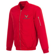 Bring bold style to your collection with the Corvette C8 Nylon Bomber Jacket in red. Made from 100% nylon, this lightweight jacket is durable and easy to wear, with a full-length zip front for convenient layering. Rib knit collar, cuffs, and waistband complete the classic bomber look while ensuring a comfortable fit.