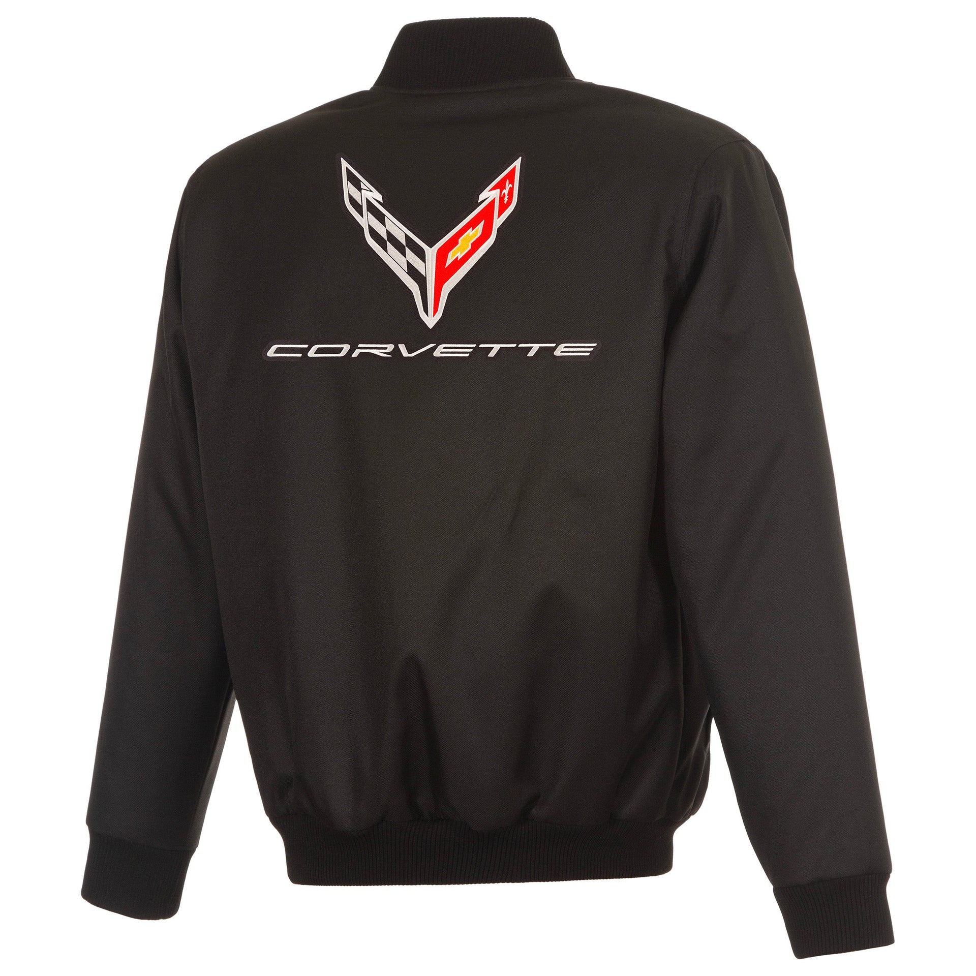 Show your Corvette pride with the Corvette C8 Poly-Twill Jacket in black. Crafted from durable 100% poly-twill, this jacket features a quilted nylon lining for warmth and comfort. Embroidered appliqué Corvette C8 logos add bold, authentic detail on the front and back, making it a must-have for fans of the iconic sports car.