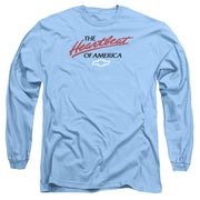 Show your Chevrolet pride in comfort and style with this officially licensed Heartbeat of America long-sleeve t-shirt. Crafted from soft, high-quality fabric, this Carolina blue tee features the classic Heartbeat of America graphic, offering warmth and a bold statement for any car enthusiast.