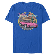 The design features a pink C4 Corvette cruising a desert highway, set against a backdrop of mesas and cacti framed in a circular border. The “Classic Corvette” lettering above the graphic adds a vintage-inspired touch, perfect for fans of America’s sports car.