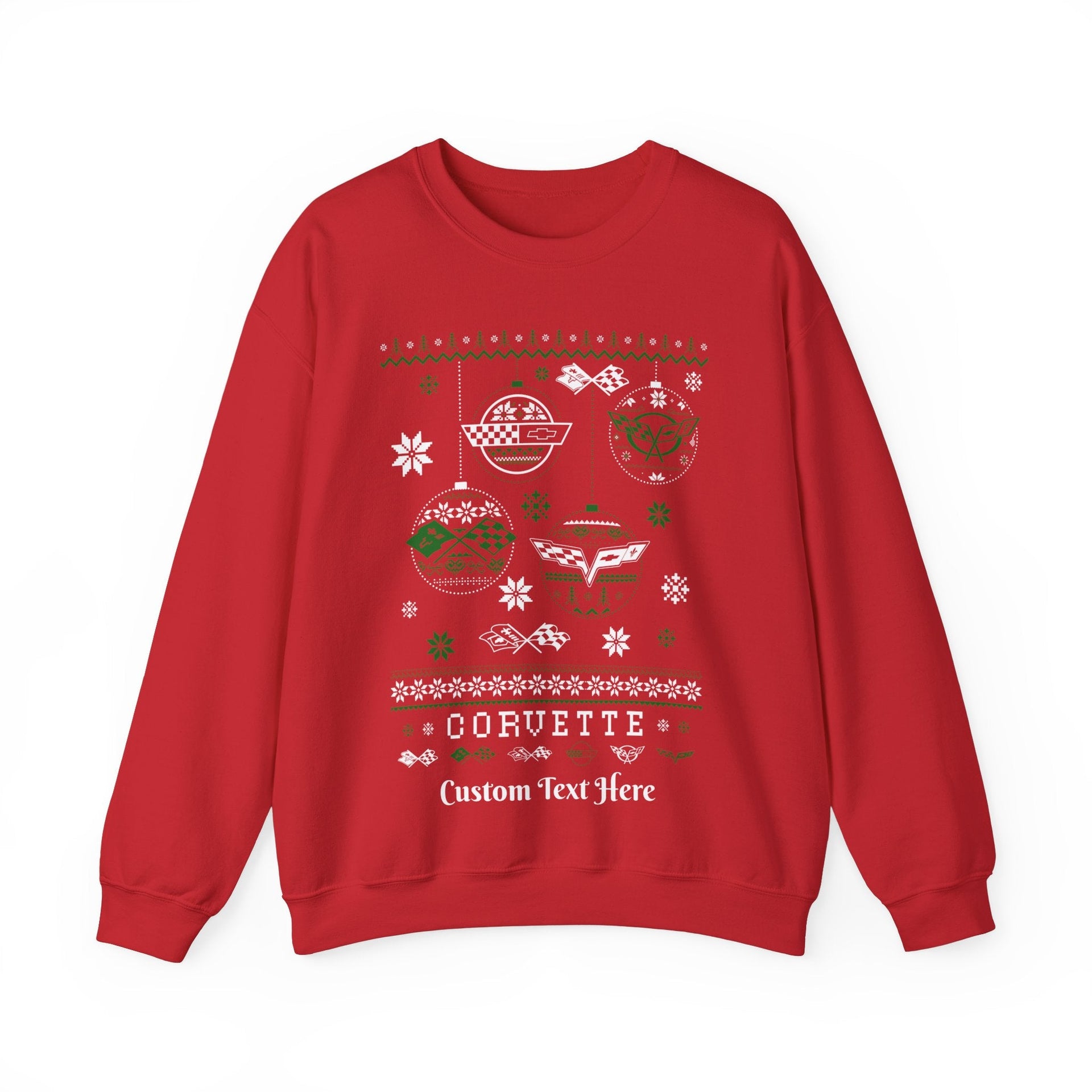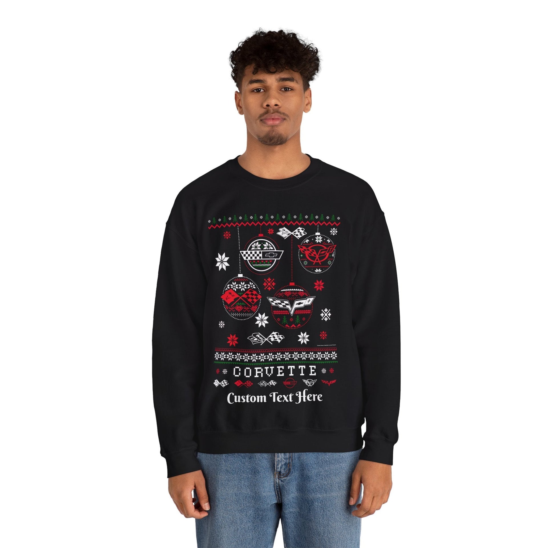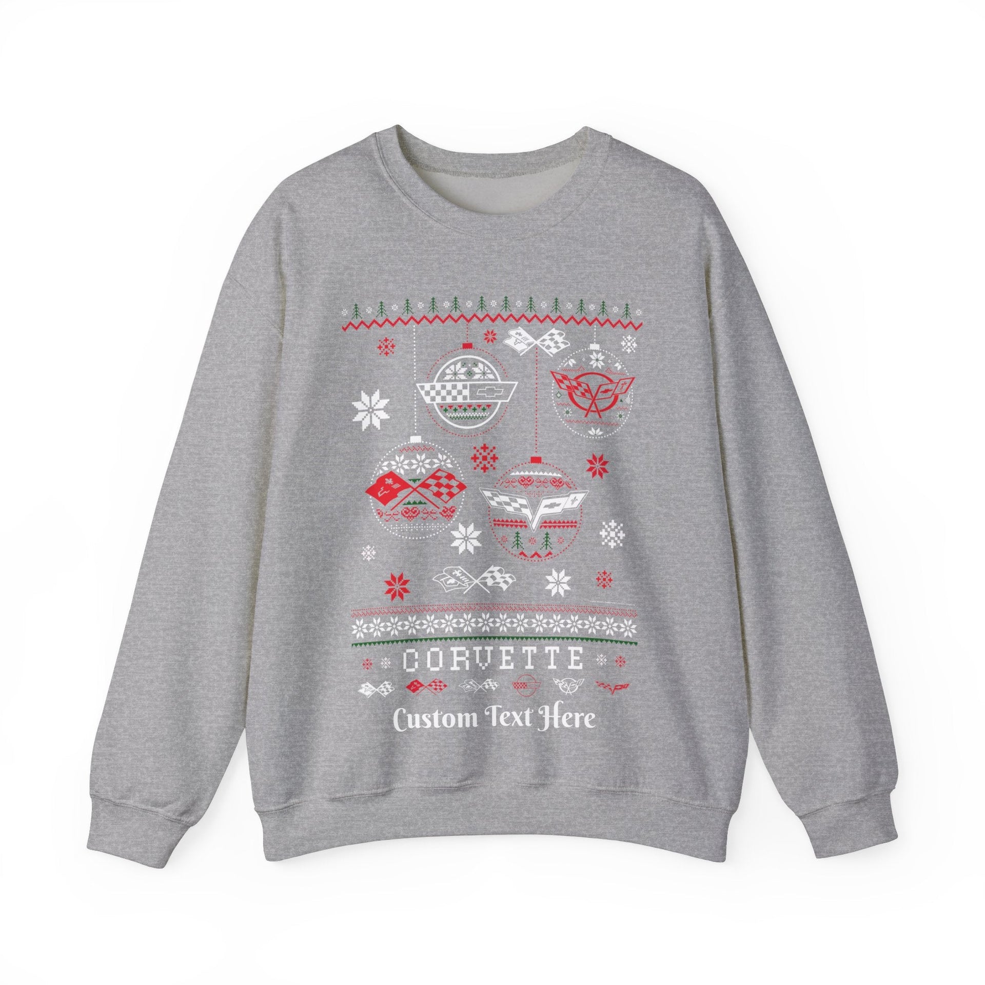 The ugly Christmas sweater has firmly embedded itself in yuletide culture. This Corvette ugly Christmas sweatshirt features multiple Christmas ball ornaments with the C1-C6 Corvette flag logos. While it's supposed to be ugly, it's hard to disguise the beauty of the Corvette brand! The added bonus is the option to personalize this sweatshirt for yourself or a Corvette fan friend or relative. This heavy blend crewneck sweatshirt is pure comfort as well. It's never too early to start shopping for Christmas!