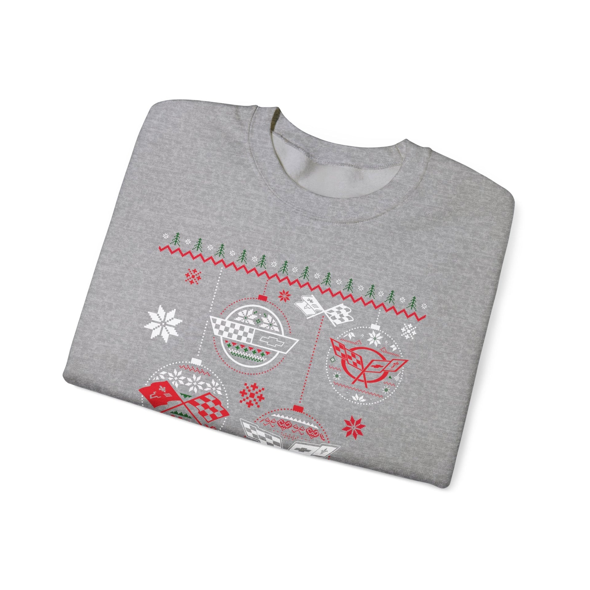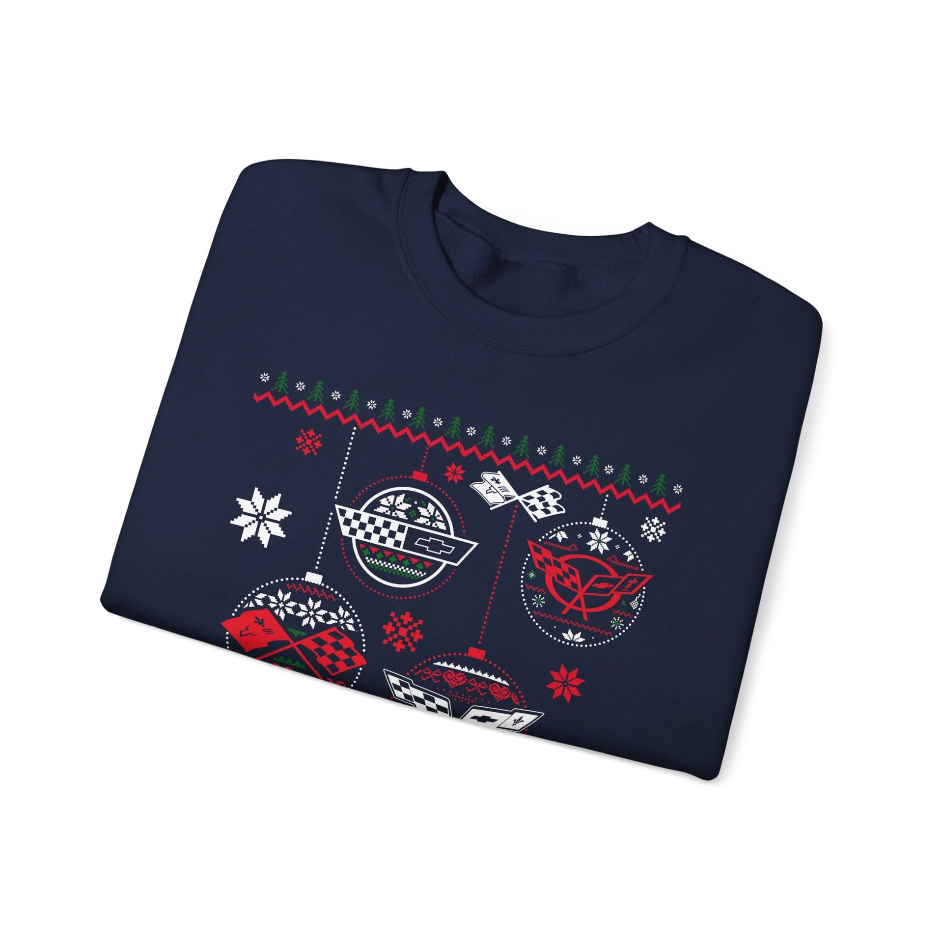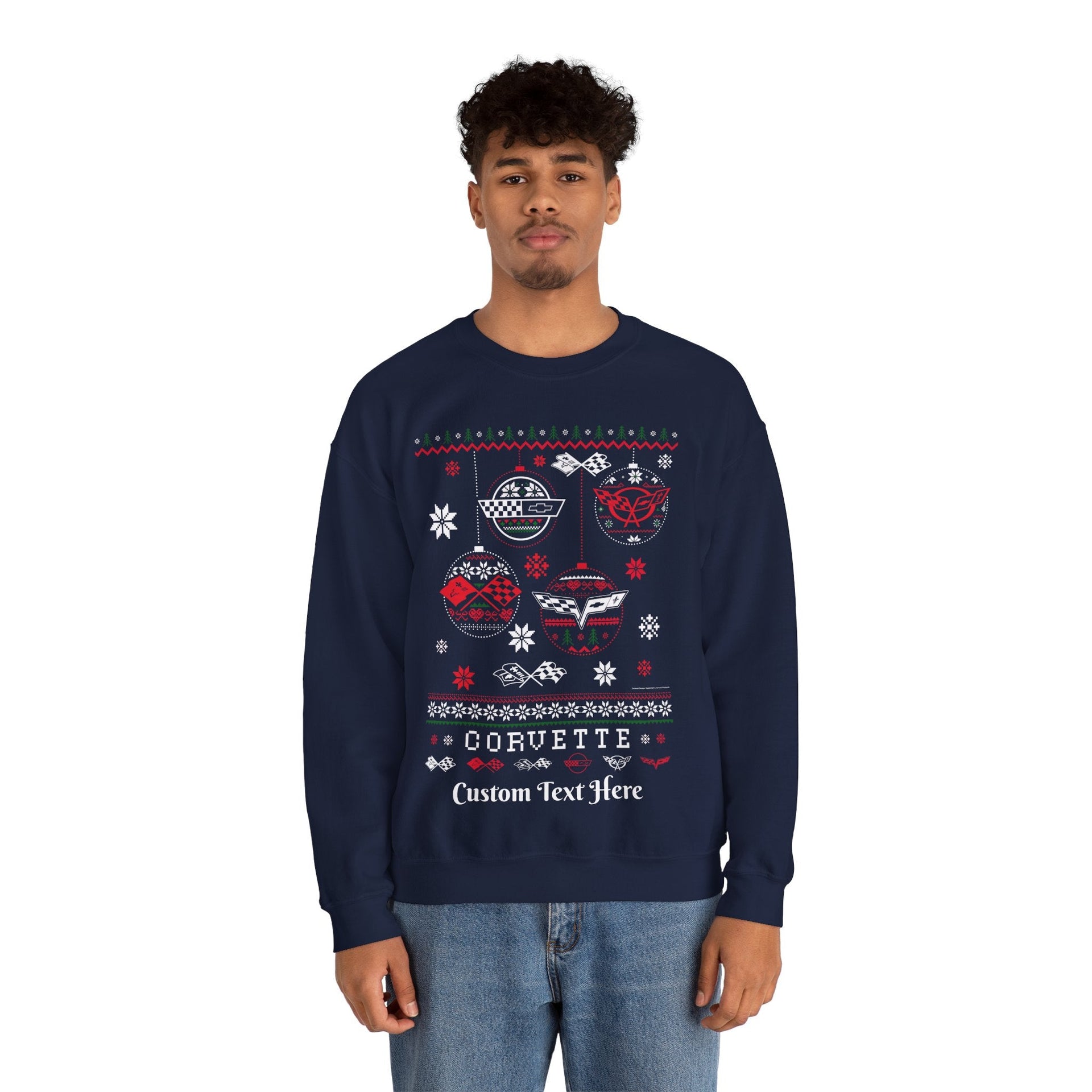 The ugly Christmas sweater has firmly embedded itself in yuletide culture. This Corvette ugly Christmas sweatshirt features multiple Christmas ball ornaments with the C1-C6 Corvette flag logos. While it's supposed to be ugly, it's hard to disguise the beauty of the Corvette brand! The added bonus is the option to personalize this sweatshirt for yourself or a Corvette fan friend or relative. This heavy blend crewneck sweatshirt is pure comfort as well. It's never too early to start shopping for Christmas!