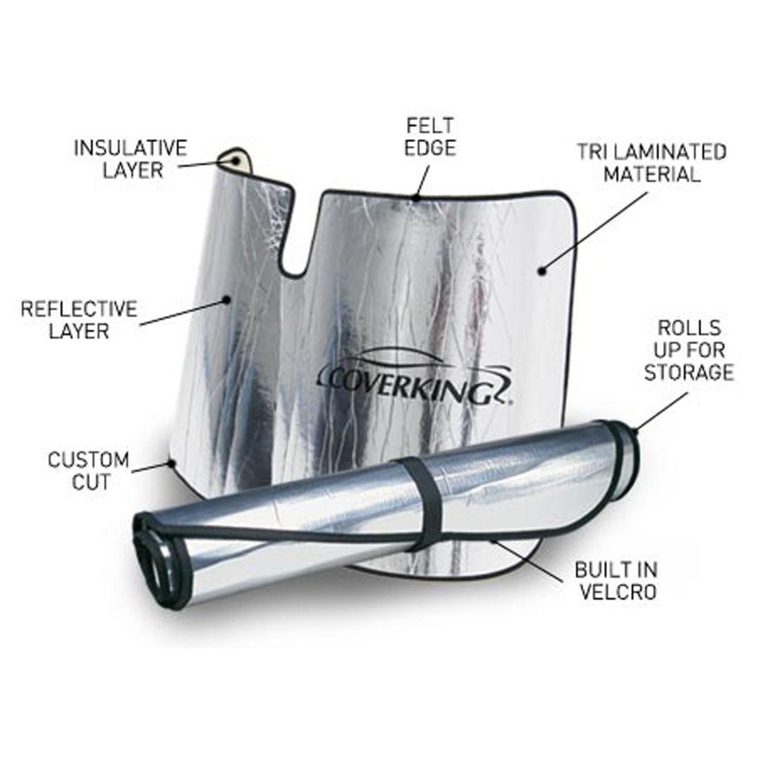 To achieve optimum reflection and insulation of heat and UV rays, most materials are still and not able to fold or roll. Coverking developed a special high-density foam which has excellent insulation properties, and laminated it between two layers of Mylar. The outer layer is Mylar with an aluminized coating, which reflects virtually all UV rays. The inside layer is plain Mylar, which adds rigidity and protects the middle foam layer. These three layers work together to provide the best heat and UV reflection, insulate against heat, and withstand numerous folding and rolling while maintaining rigidity to hold it's shape while on the windshield.