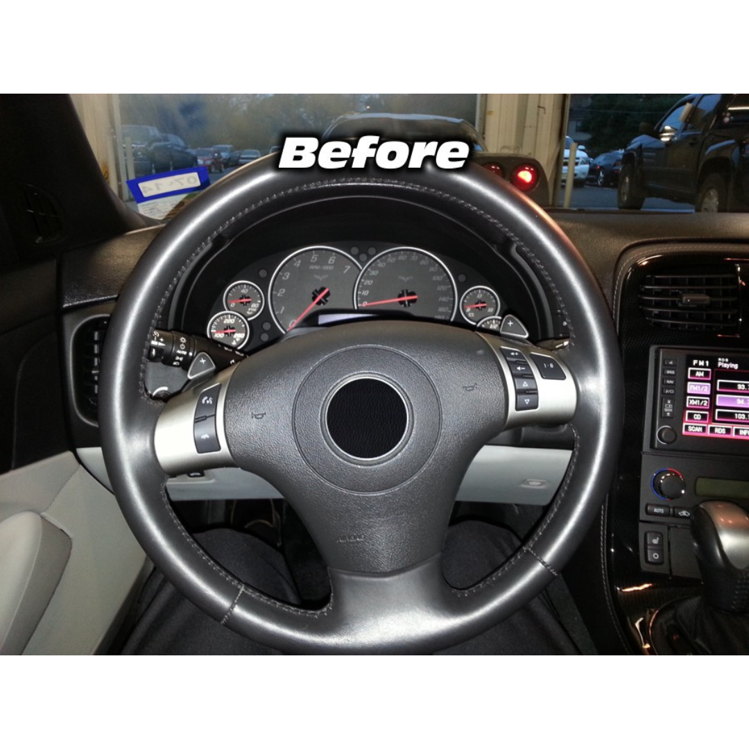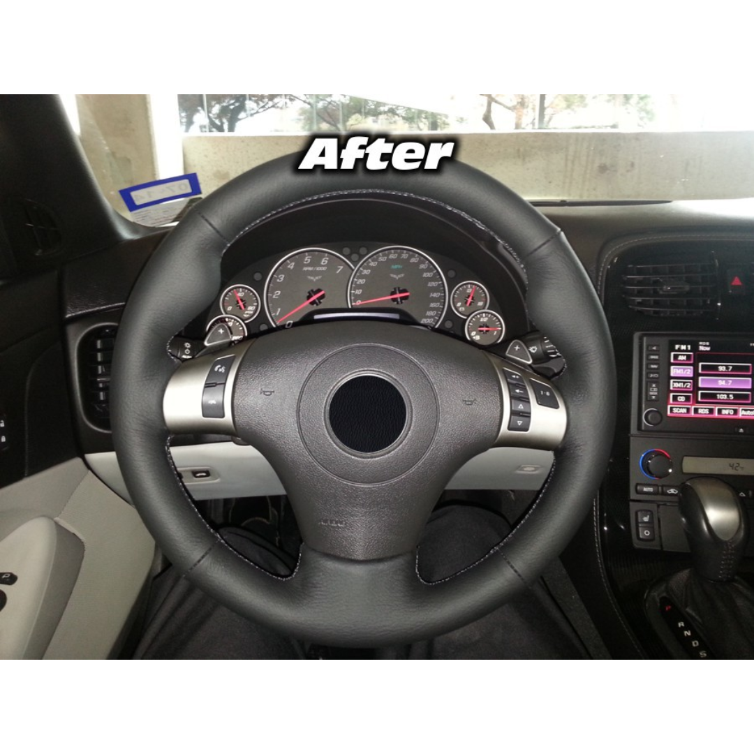 Our Chevrolet Corvette C6 steering wheel cover reupholsters both rim and spokes, unlike some of competing products. Makes your Chevrolet Corvette C6 steering wheel look better than new! Hand made from finest Italian leather, fits like original equipment.