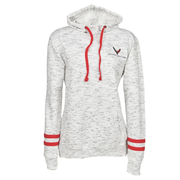Features a scuba-style hood with contrast drawcords and stripe detailing.