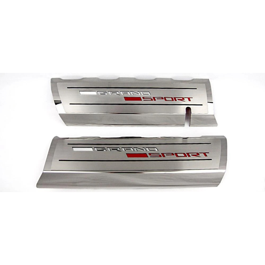 Dress up your Corvette with our GM Official Licensed polished and brushed stainless steel Grand Sport Fuel Rail Covers Factory Overlay with white and red vinyl inlaid lettering. These overlays install easily over factory fuel rails, adds a custom look to your Corvette engine bay.