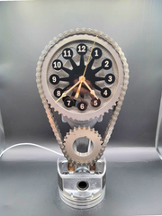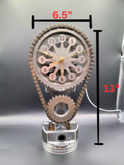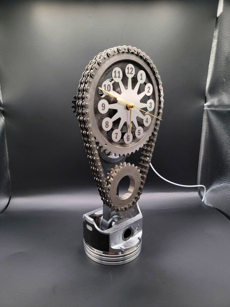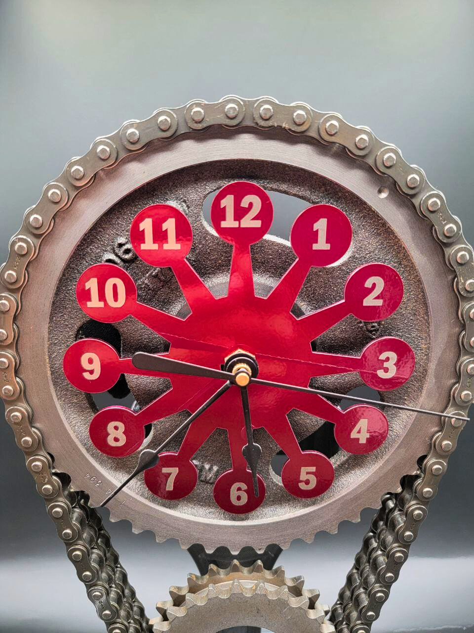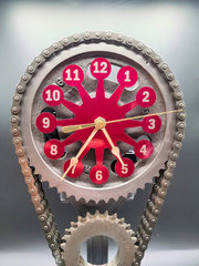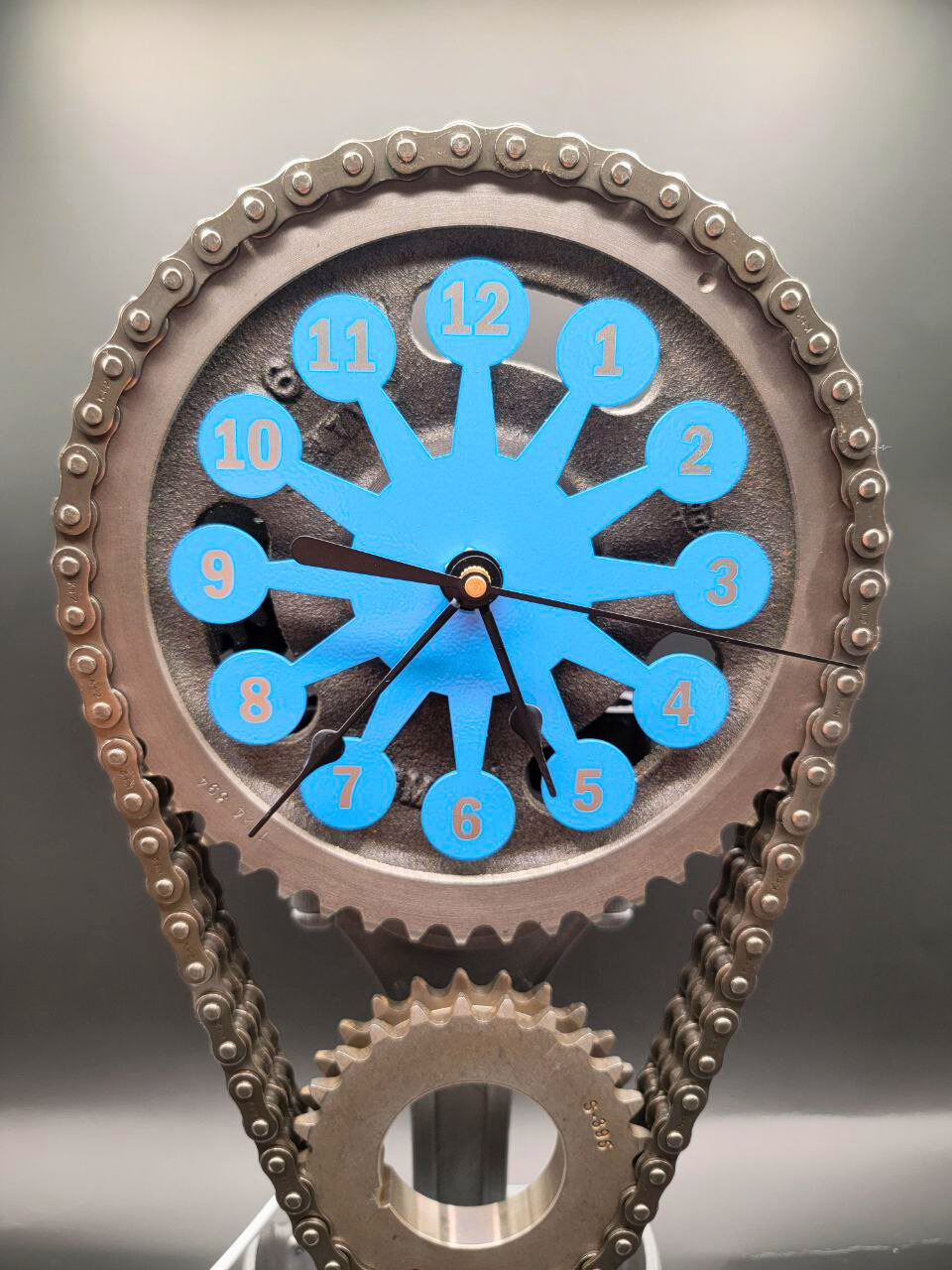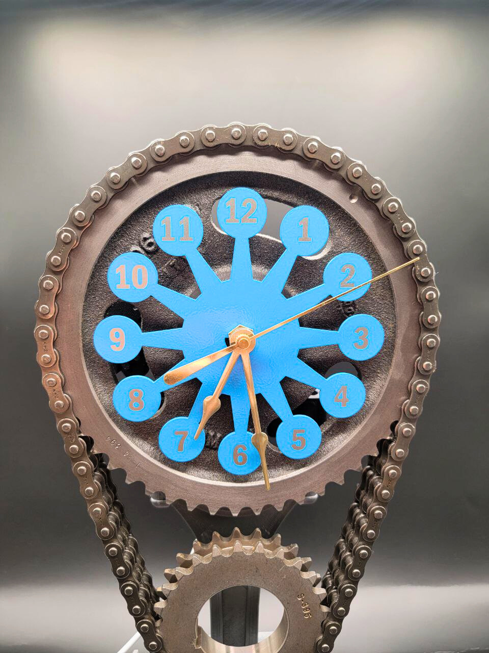 Introducing the Chevy 454 Timing Chain Clock, expertly crafted with a double roller chain Timing Set from Chevy Big Block engines. Outfitted with a unique motorized design, this clock features gears that rotate just like the mechanics of a real engine. The Stainless steel Clock faces are designed, powder coated and engraved for a sleek, very durable coating. Lifetime Parts Warranty.