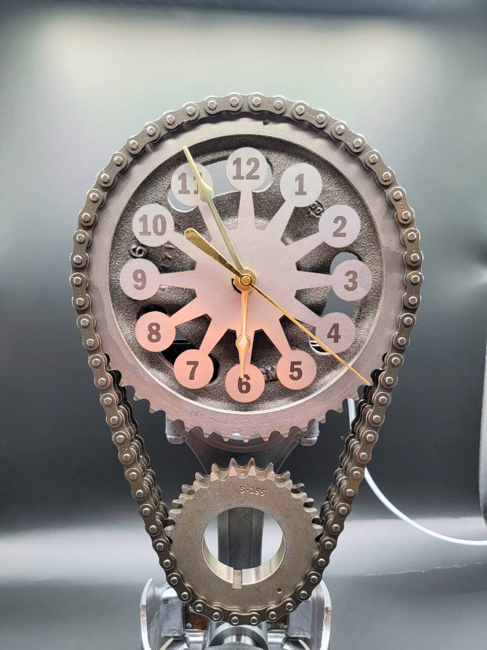Chevy Big Block Timing Chain Clock, Powder Coated Metal Face, Rotating Gears
