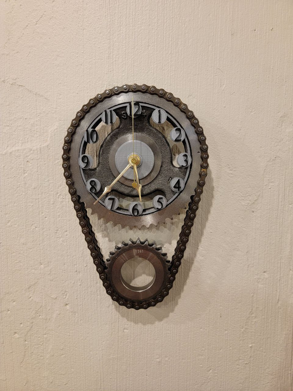 Introducing our stunning Chevy Wall Clock, crafted from the Double Roller Timing Chain of Chevy big block engines. This clock features a unique design with a brand new timing set fitted with custom 3D prints, transforming it into a beautiful hanging wall clock. While the timing set retains some natural patina, it offers a vintage aesthetic. Available in various colors to match your decor, just contact us for special requests! Measuring 6.5 inches wide by 10 inches tall, this clock hangs effortlessly on the wall with its attached metal hanger. Please note, this model does not feature rotating gears.