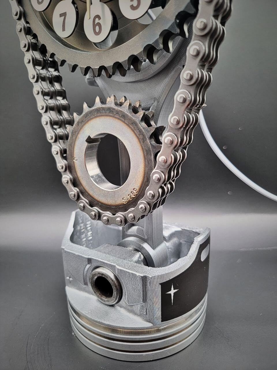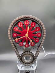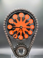 The Timing Chain Clock, also known as a rotating gear clock, is crafted from a double roller chain Timing Set of Chevy Small Block engines. This clock features custom motorized gears that rotate like a real engine, making it a perfect piece for car enthusiasts and lovers of automotive decor. The Stainless steel Clock faces are designed, powder coated and engraved for a sleek, very durable coating.