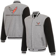 Show your Corvette pride with the Corvette C8 Reversible Two-Tone Fleece Jacket in gray and black. Made from soft fleece for warmth and comfort, this versatile jacket reverses to a sleek nylon lining, offering two distinct looks in one. Embroidered Corvette logos are featured on both sides, making it easy to display your passion no matter how you wear it.