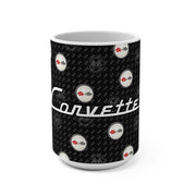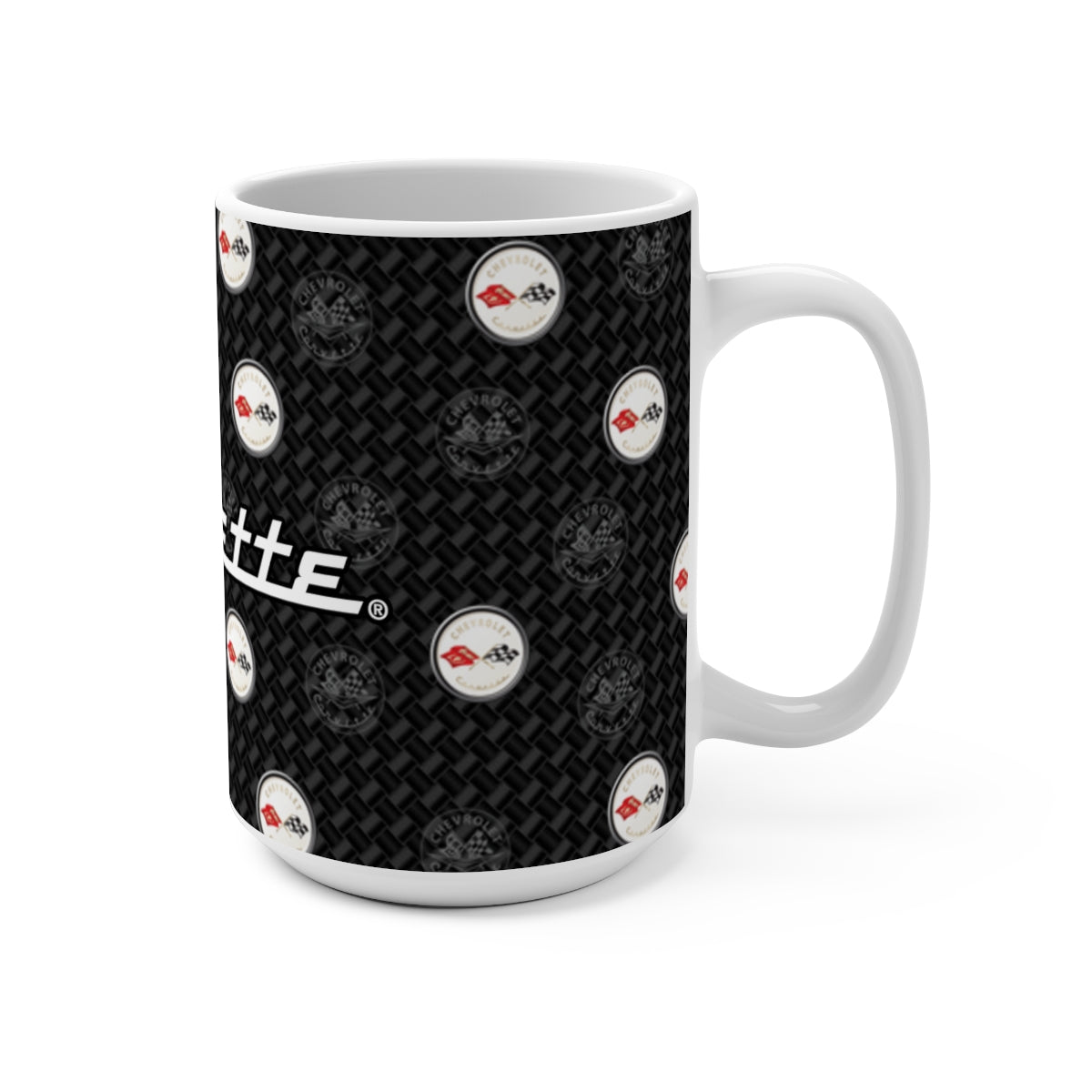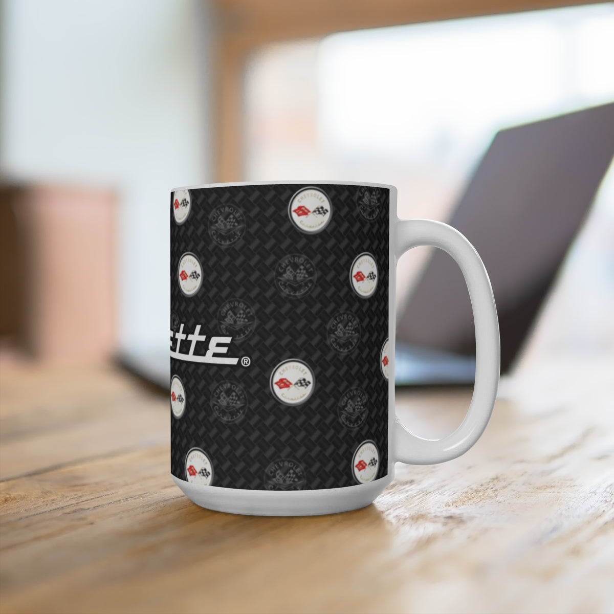 Corvette C1 15oz Ceramic Mug – Corvette Script & C1 Logos on Carbon Background