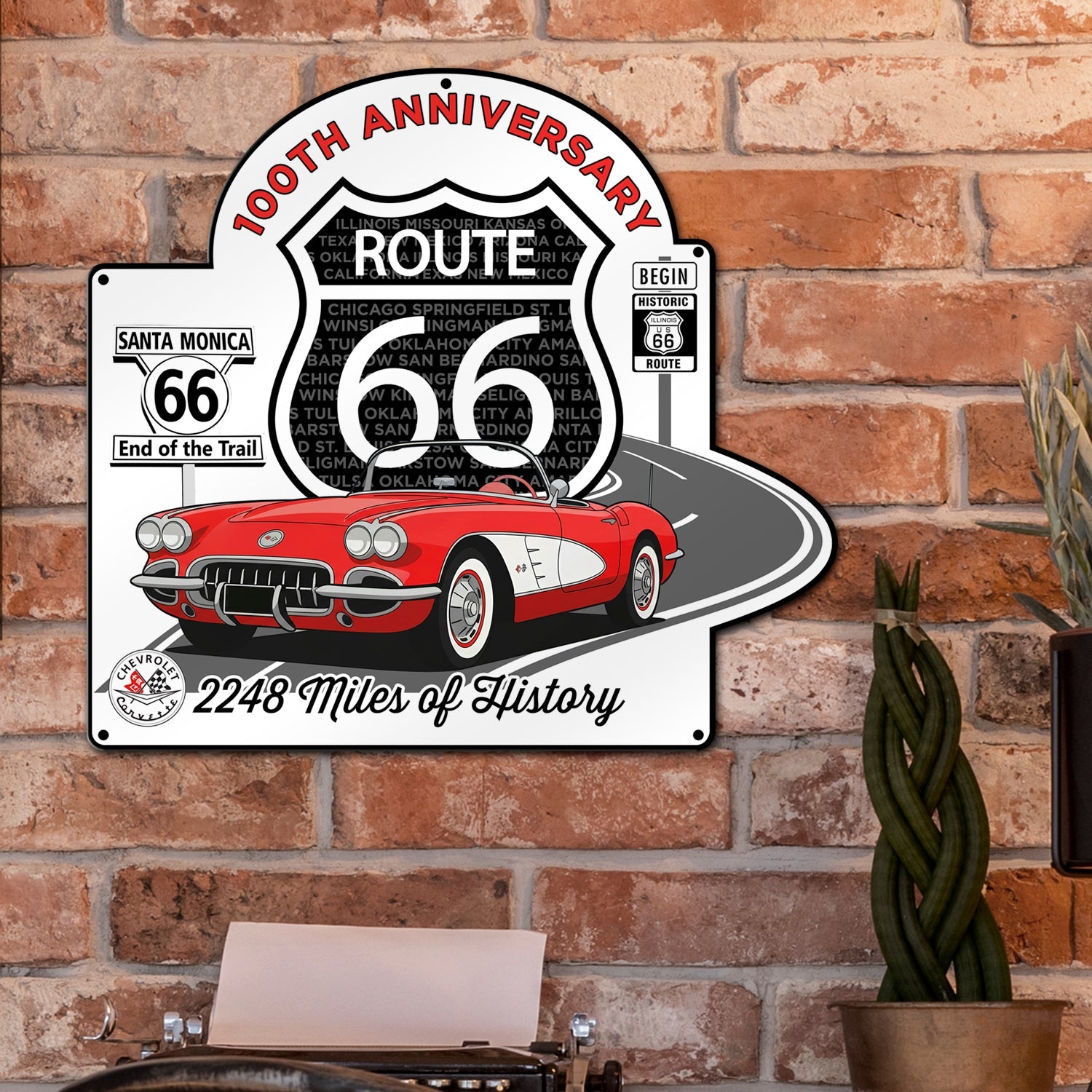 Route 66 100th Anniversary Metal Sign – Red C1 Corvette Edition- Available in 2 Sizes