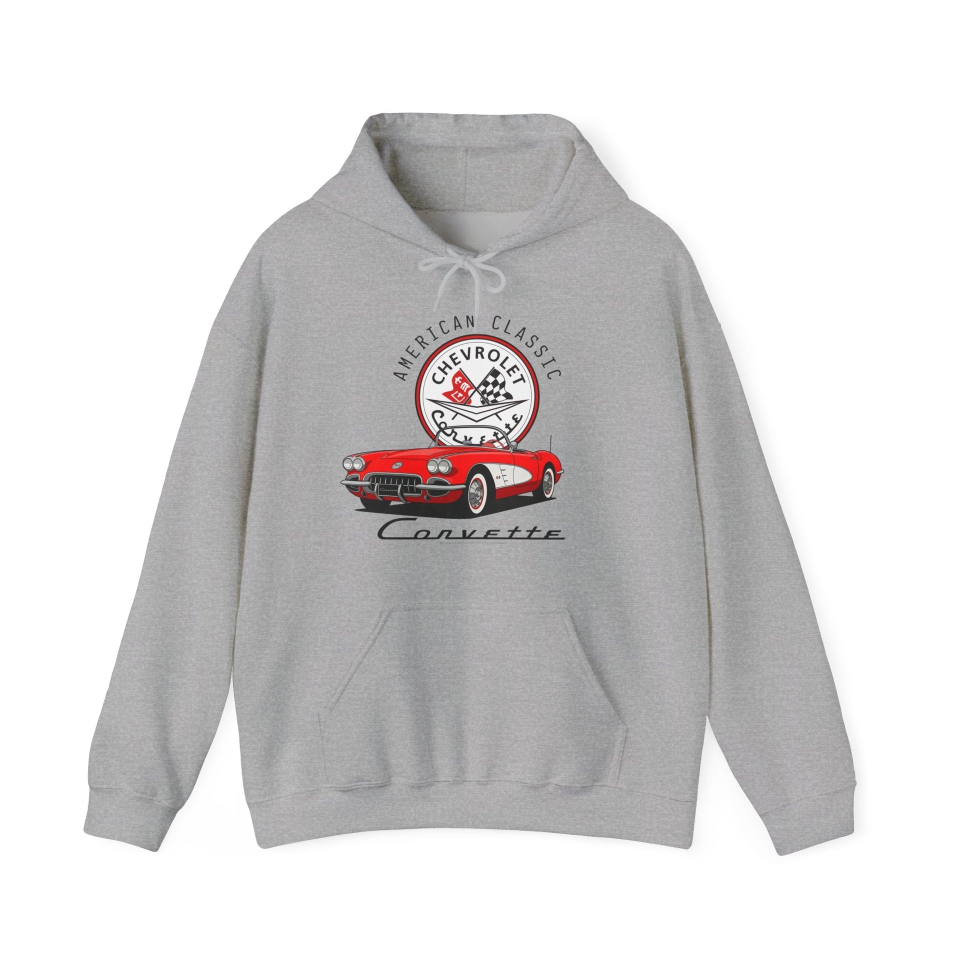 Celebrate the thrill of the drive with this Legends of the Road cotton blend hooded sweatshirt, featuring the C1 Corvette with “American Classic” branding and the vintage emblem. The artwork pays tribute to the timeless appeal of the Corvette, making it a standout piece for any enthusiast. Perfect for cool, crisp days, this hoodie offers a classic fit, spacious kangaroo pouch pocket, and tear-away label for comfort. Ideal for the Corvette fan or as a special treat, this hoodie exudes a sporty and vintage vibe, making it a perfect addition to any wardrobe. Perfect for wearing during car shows, race events, or as a gift for car enthusiast.