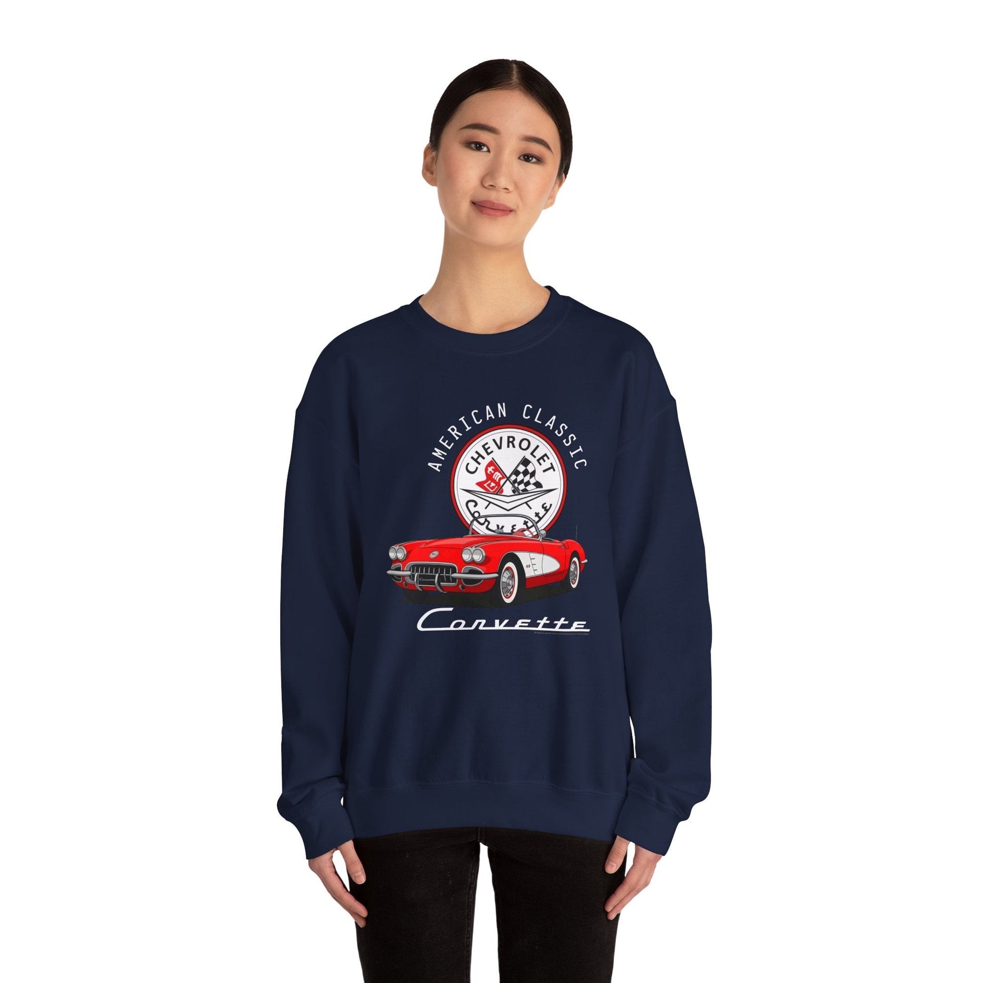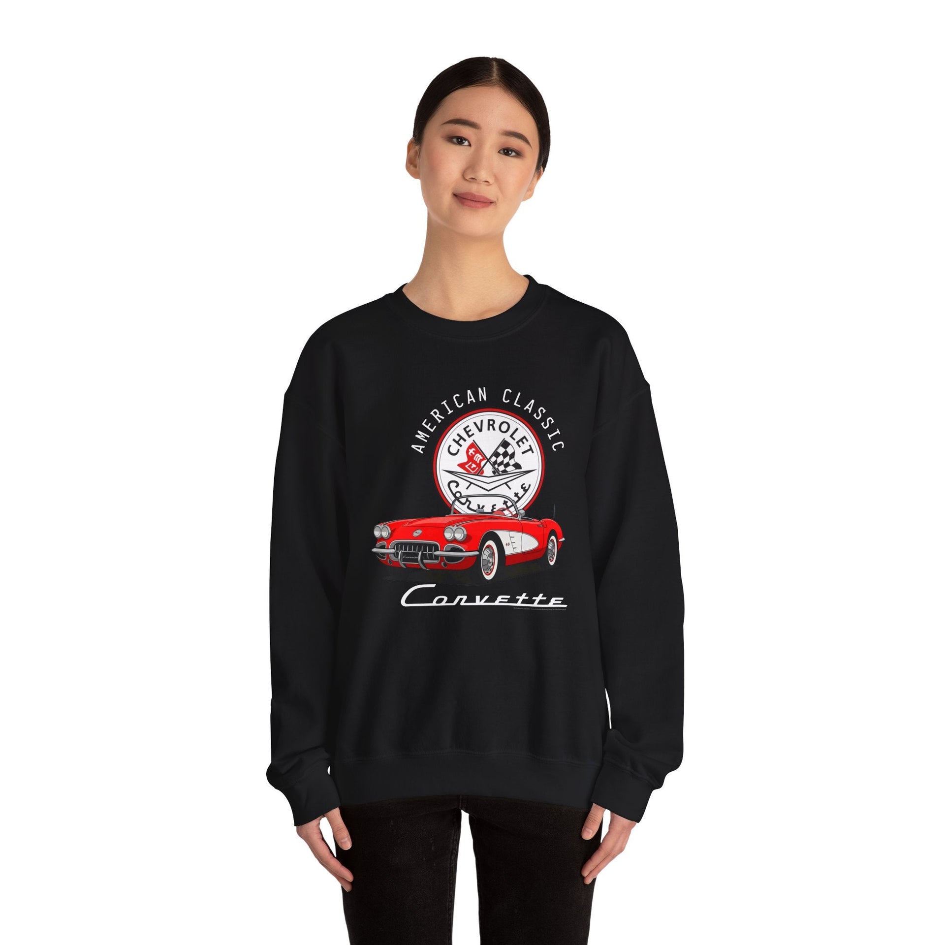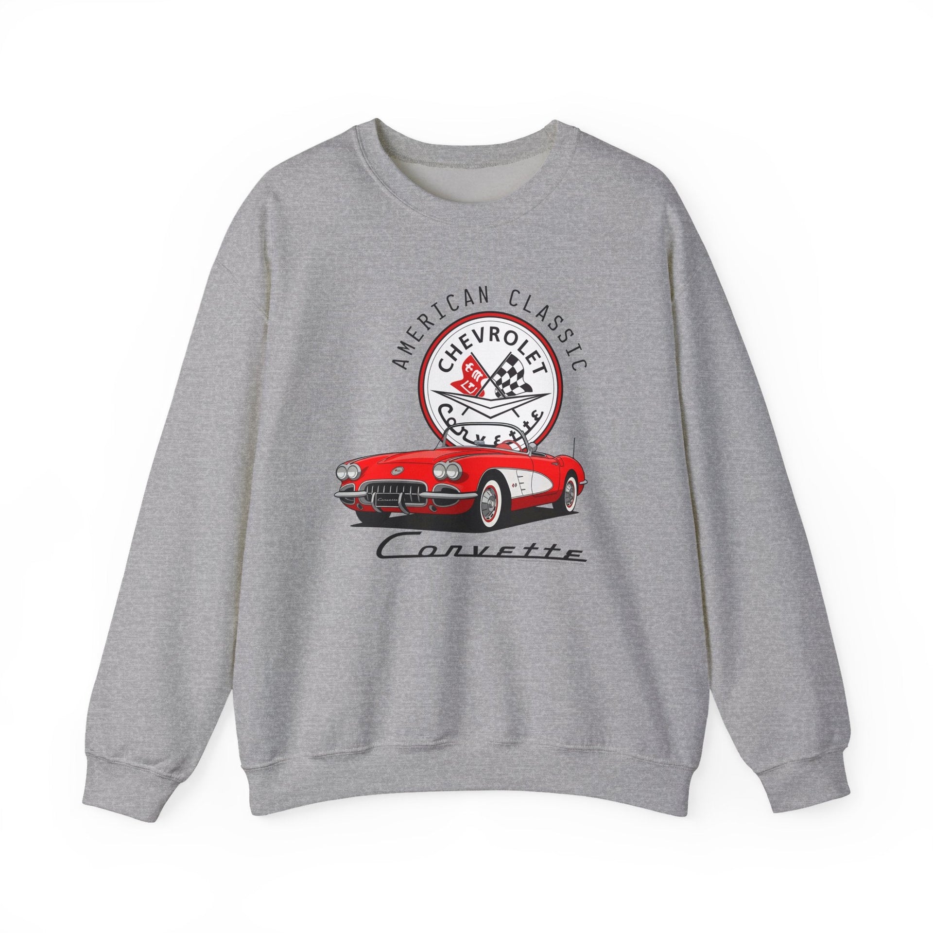 Celebrate the thrill of the drive with this Legends of the Road cotton blend sweatshirt, featuring the C1 Corvette with “American Classic” branding and the vintage emblem. The artwork pays tribute to the timeless appeal of the Corvette, making it a standout piece for any enthusiast. Perfect for cool, crisp days, this sweatshirt offers a classic fit, and tear-away label for comfort. Ideal for the Corvette fan or as a special treat, this sweatshirt exudes a sporty and vintage vibe, making it a perfect addition to any wardrobe. Perfect for wearing during car shows, race events, or as a gift for a car enthusiast.