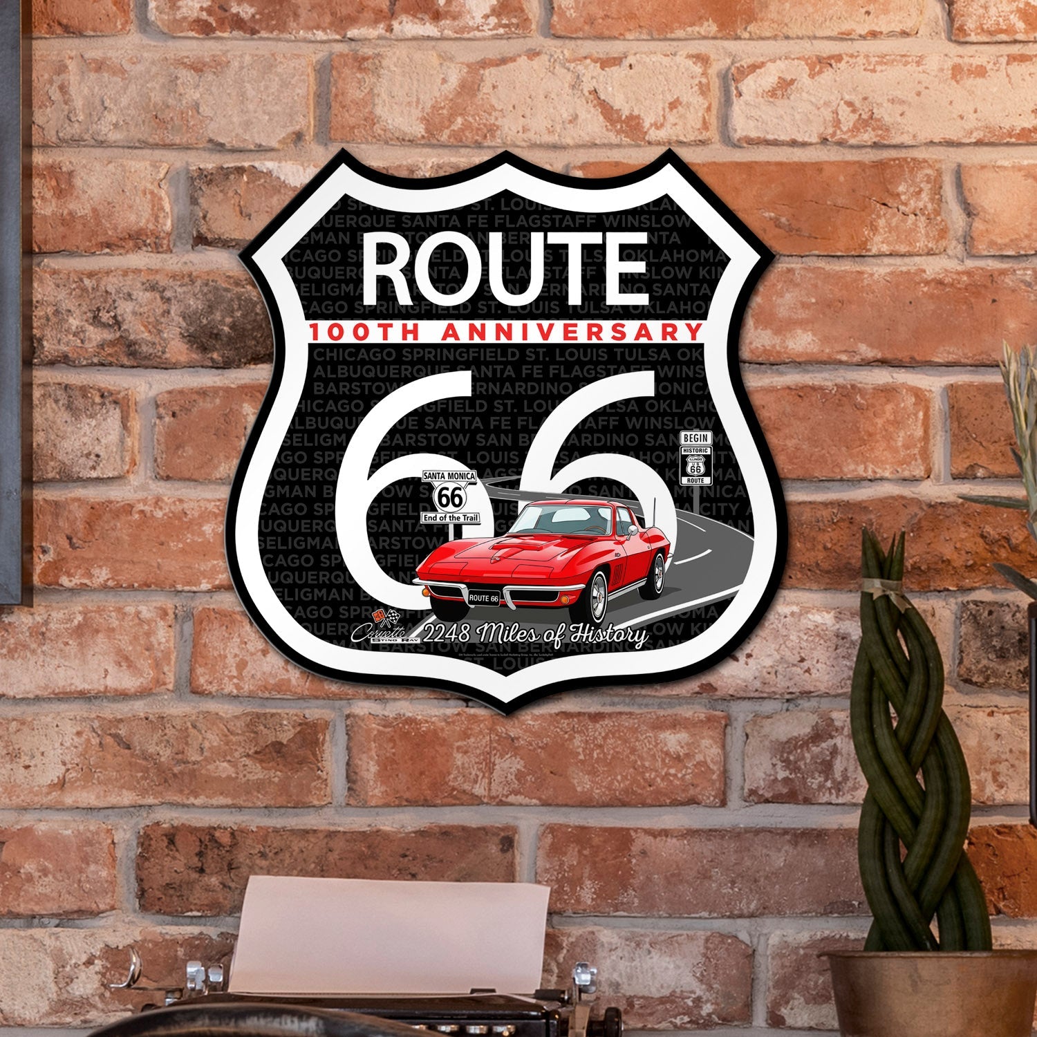Celebrate a century of America’s most iconic highway with this C2 Corvette Route 66 100th Anniversary Die-Cut Shield, featuring a bold design and classic red convertible. Shaped like the legendary Route 66 road sign, this commemorative piece highlights the full 2,248-mile journey from Chicago to Santa Monica. With vivid city names, “2248 Miles of History” text, and a striking red-on-white anniversary banner, this USA-made artwork is perfect for collectors, car enthusiasts, and fans of vintage Americana. Its durable construction and unique silhouette make it ideal for wall display or gifting. Available in 2 Sizes.