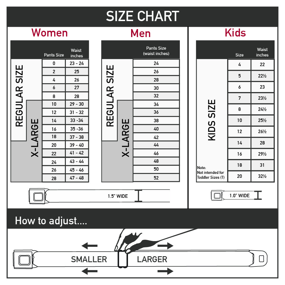 - Our adult-size Seatbelt Belts are 1.5 inches wide and our kid-sized Seatbelt Belts are 1.0 inch wide.