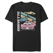 The design features three colorful C3 Corvettes in pink, yellow, and teal, displayed from different angles — front, rear, and side. A checkered flag and Chevrolet logo accent the layout, while the bold vertical “Corvette” lettering ties the look together with vintage flair.